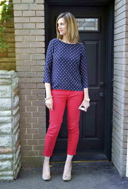 When my little guy has a great nap I go through my closet and figure out what to wear and post on this blog, sometimes the outfits work and sometimes they don't. I try and keep key pieces (same top different bottoms or vice versa) consistent that way I know how versatile the articles of clothing are and it's just easier to take pictures. That's what happened today with the J Crew anchor top, I wanted to see if I could do more than a casual outfit with red jeans and paired it with a pencil skirt - J Crew Hot (Neon?) pink. I decided to be bold. I like it.